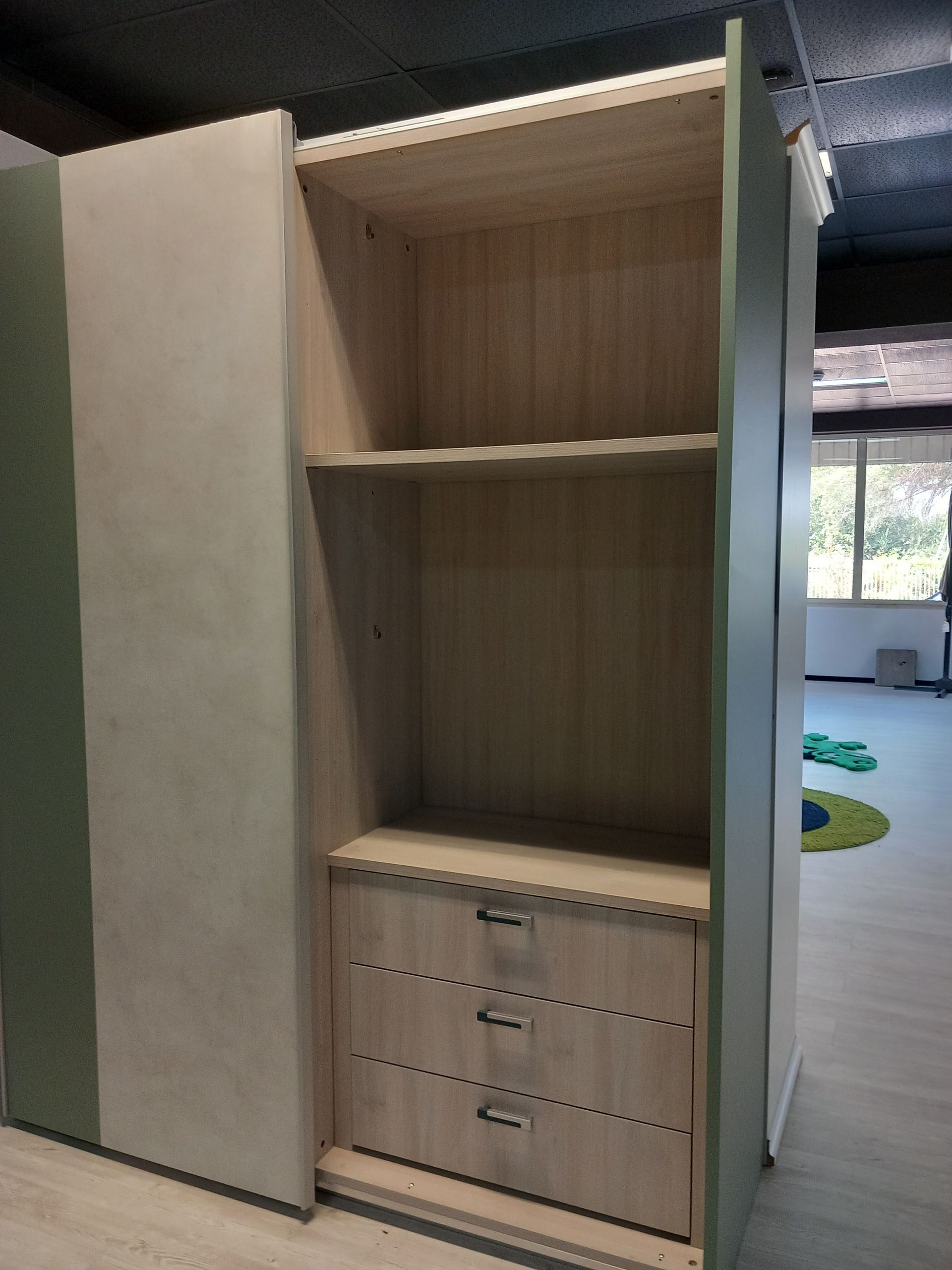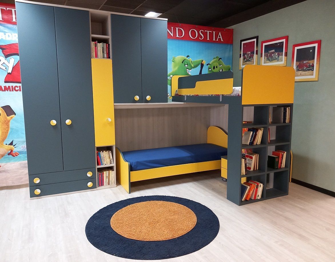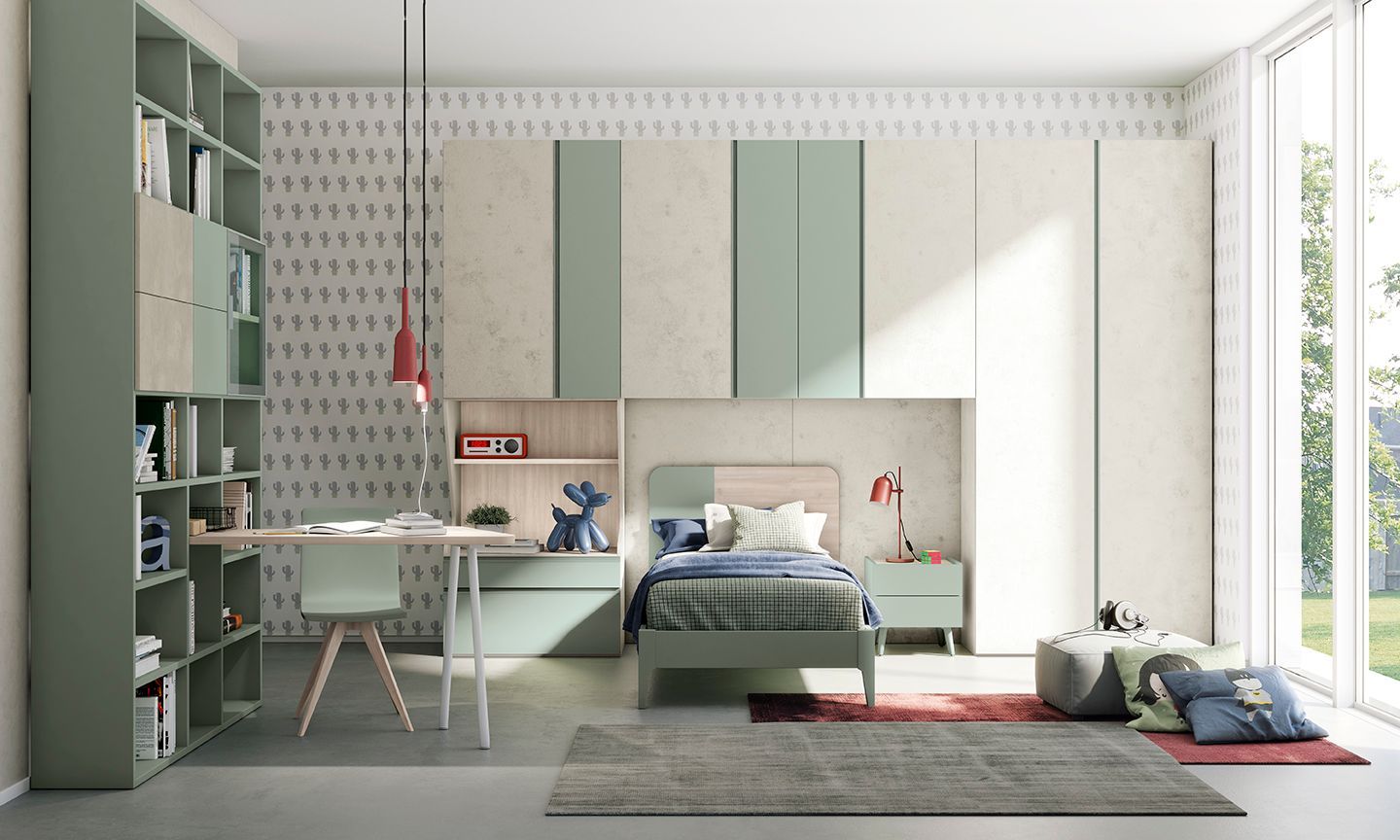 Letto singolo con armadio con parte alta, scrivania con libreria