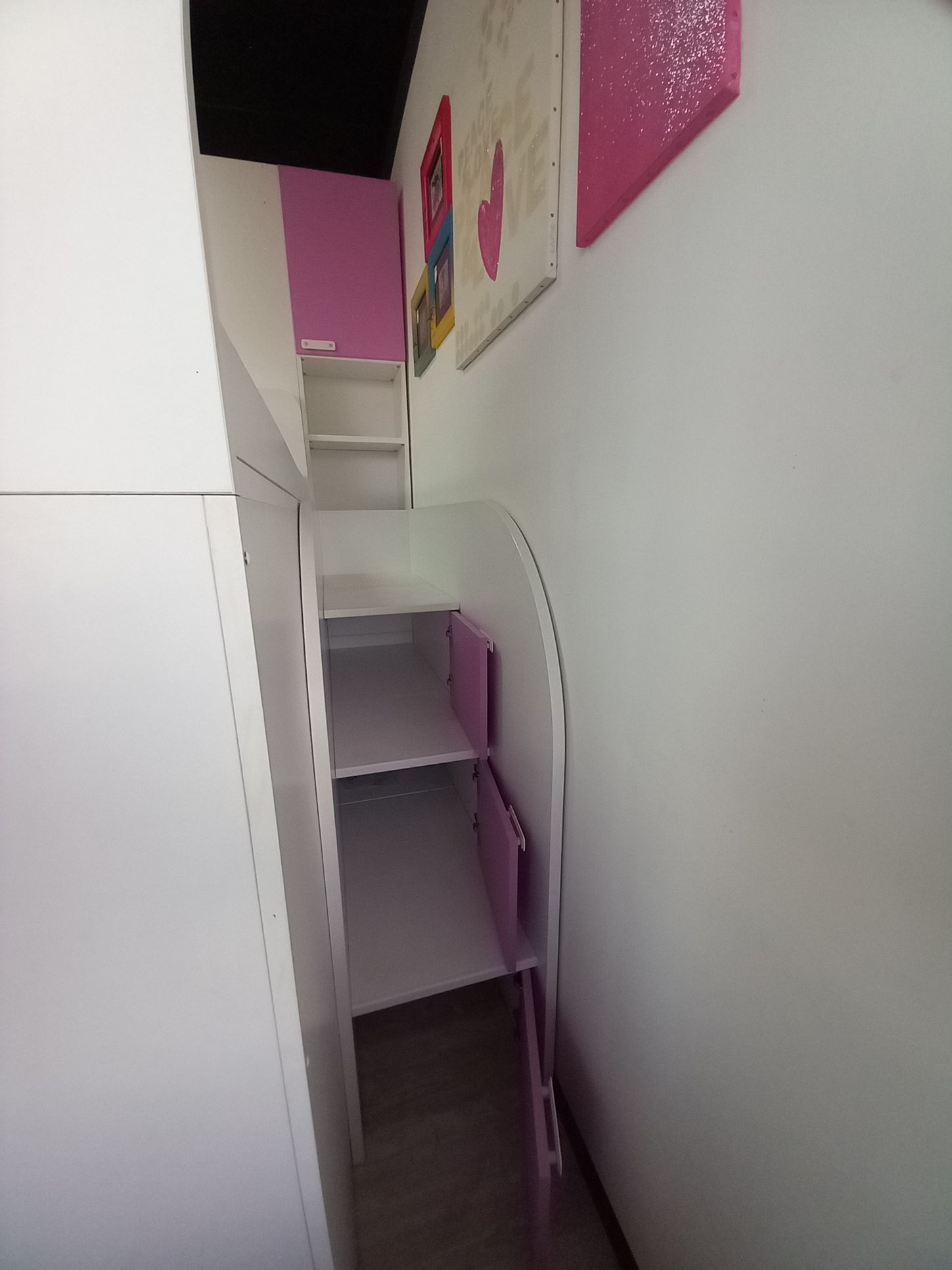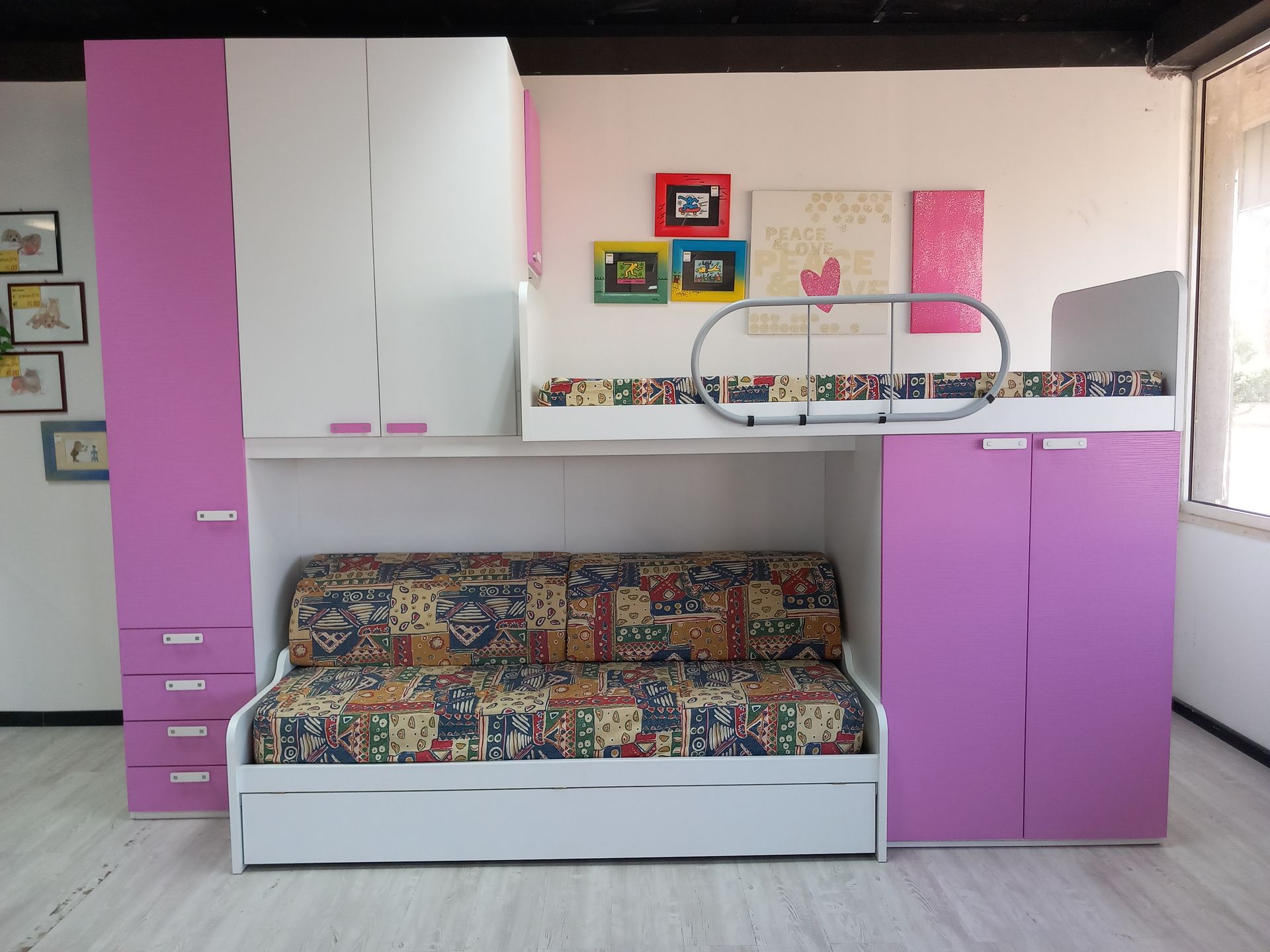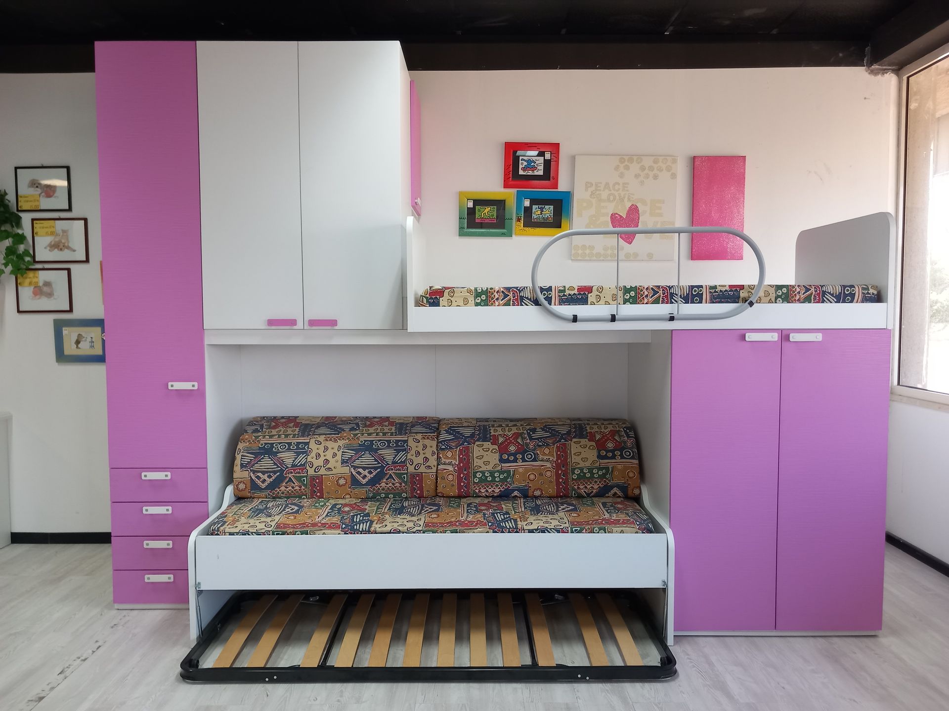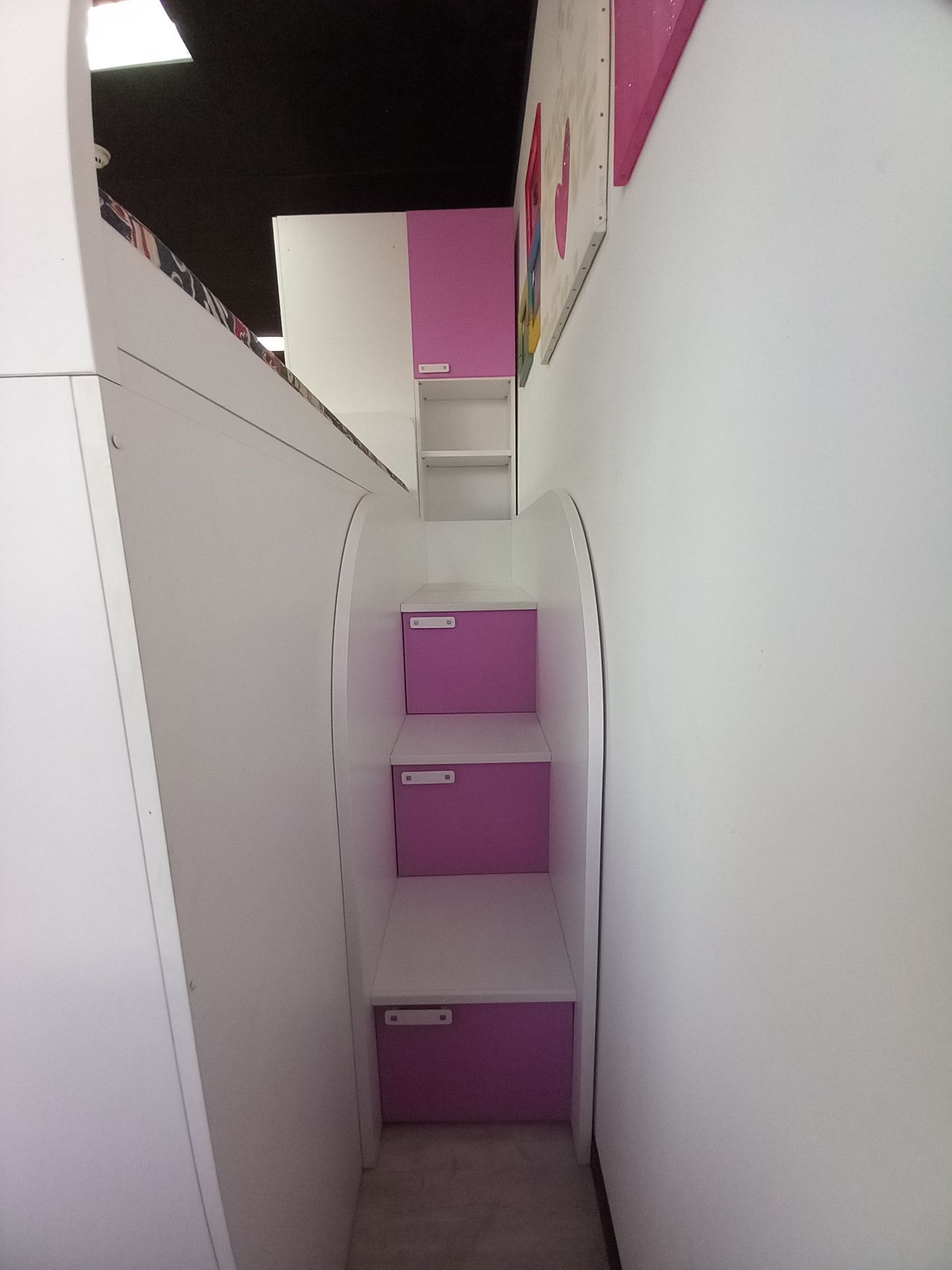 Armadio ponte soppalco con 3 letti, scala con contenitori posteriore e pedana, finitura bianco e ciclamino da € 3.880,00
