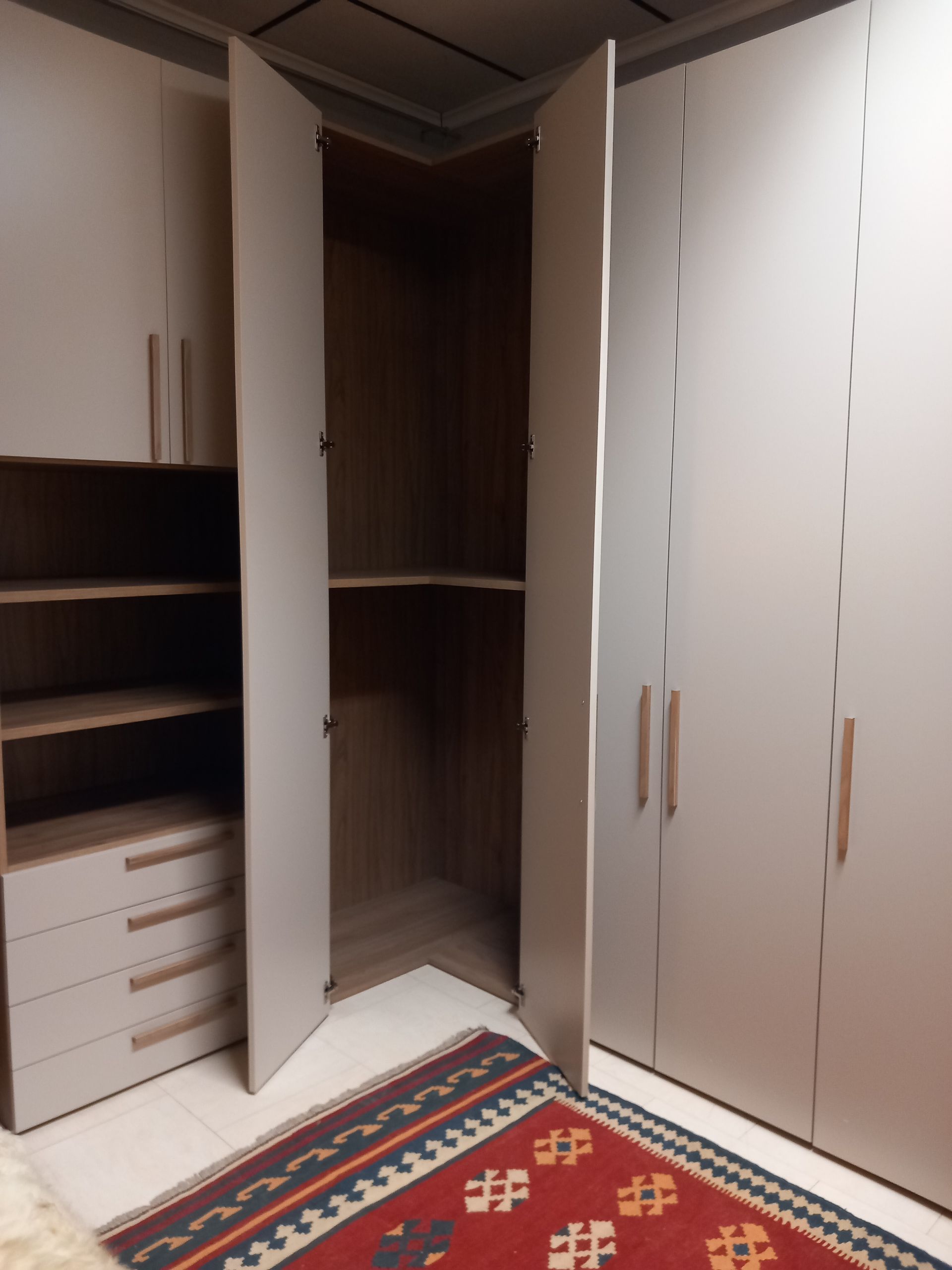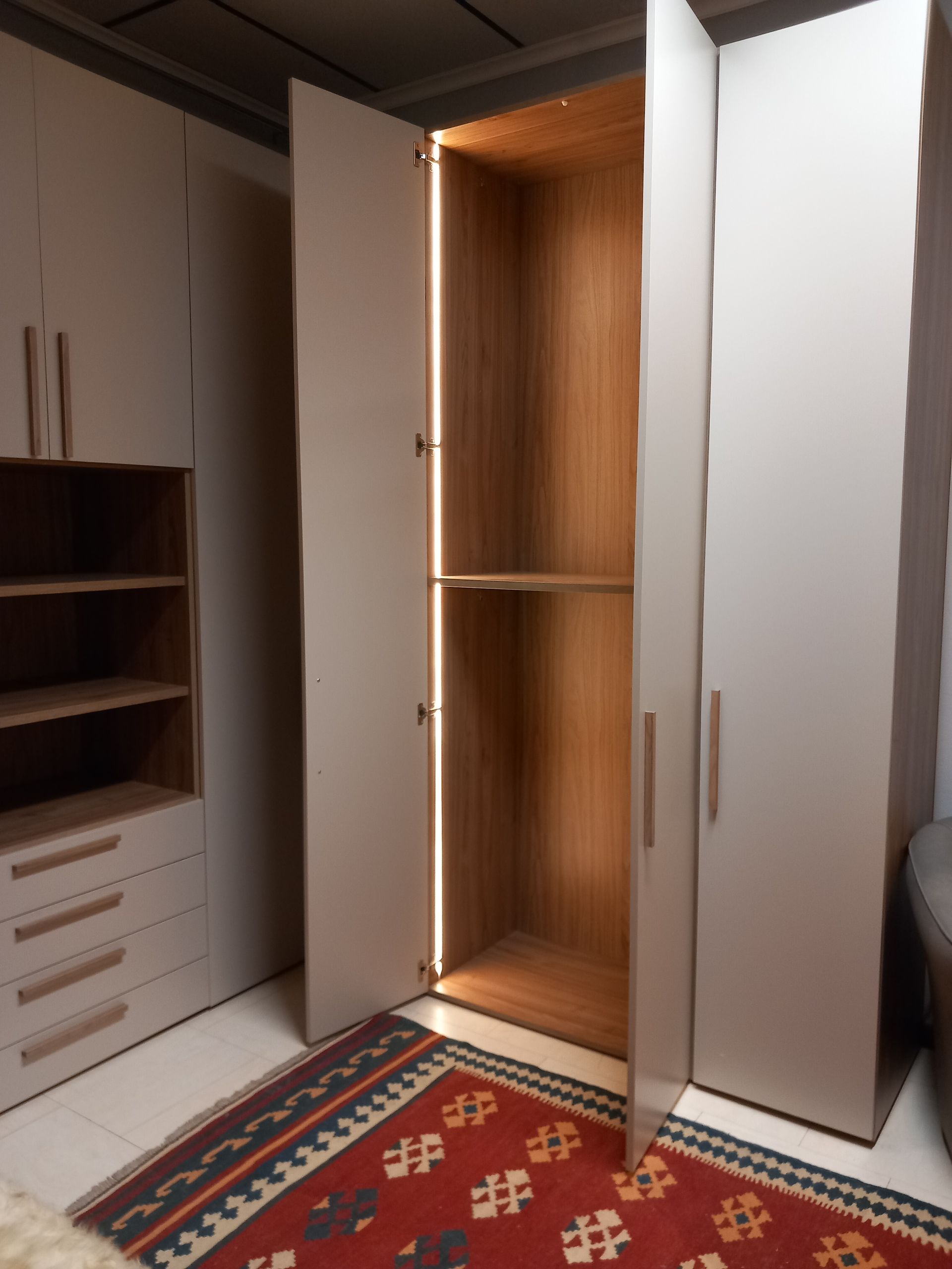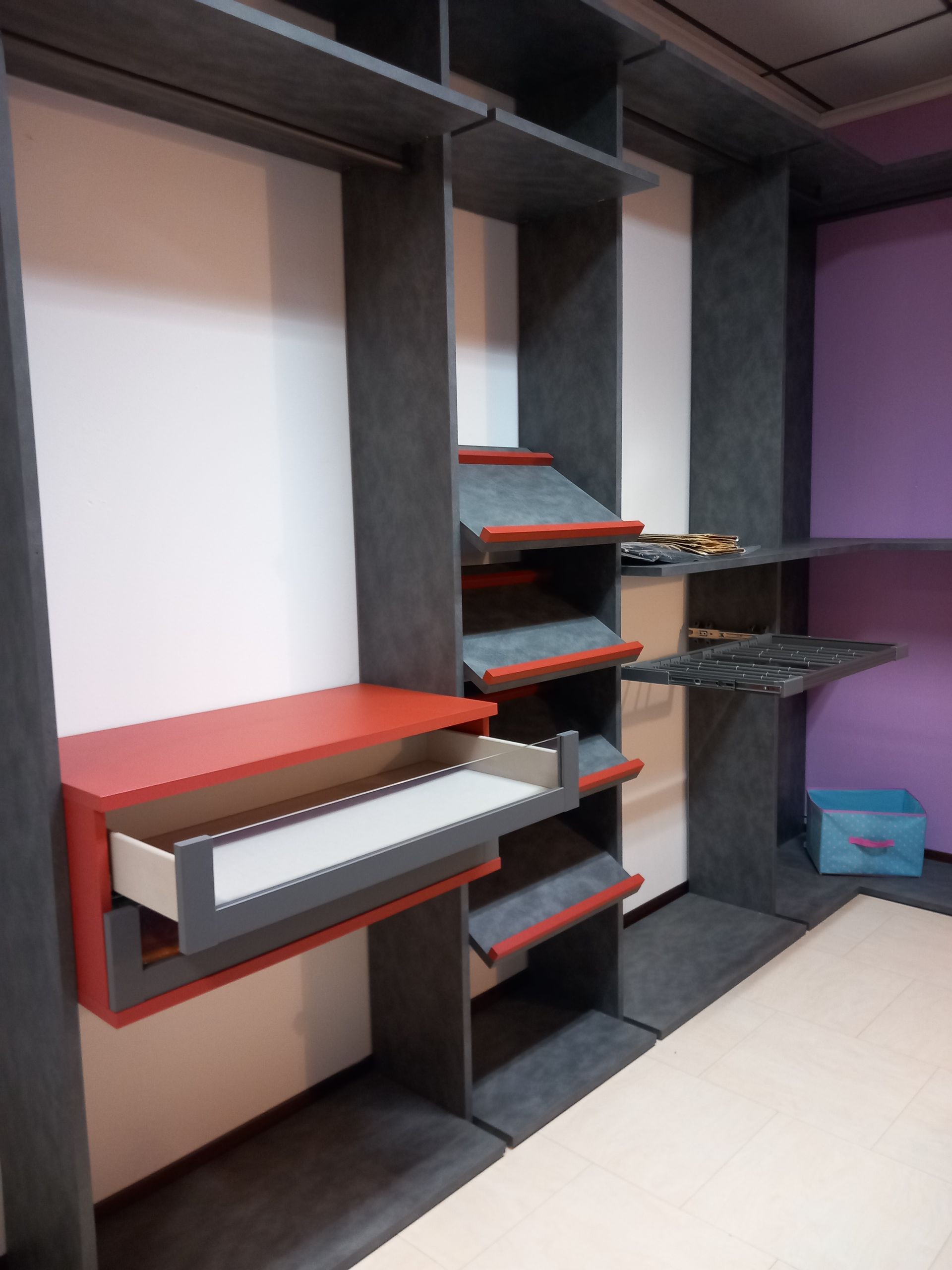 Cabina armadio con cassettiere, ripiani porta scarpe, porta pantaloni estraibile