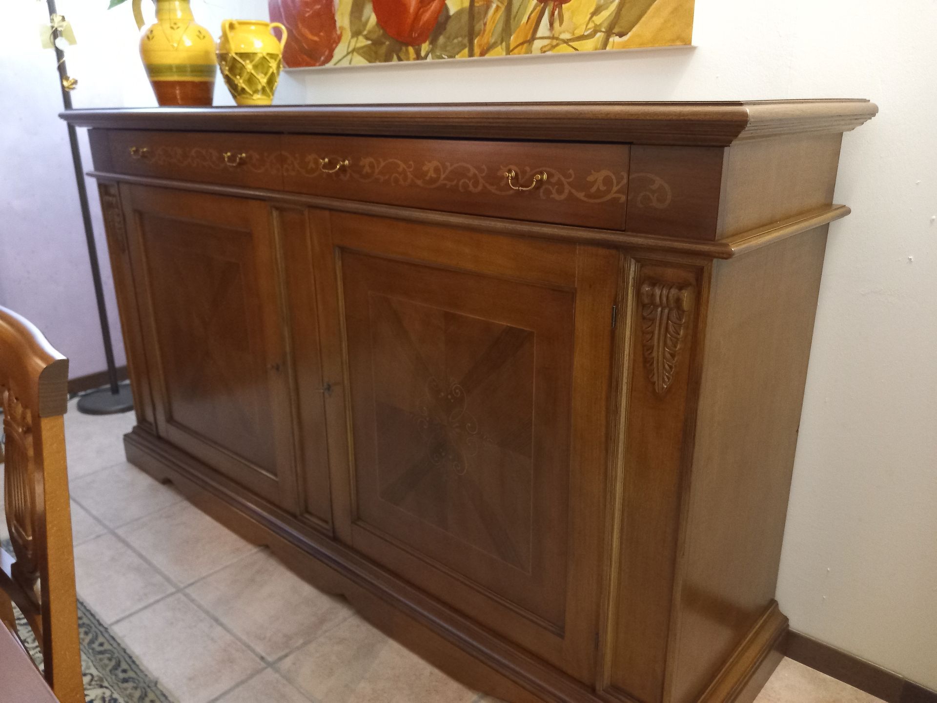 Sala da pranzo in legno finitura Bassano con intarsi, completa di vetrina, credenza, tavolo allungabile e 6 sedie in legno