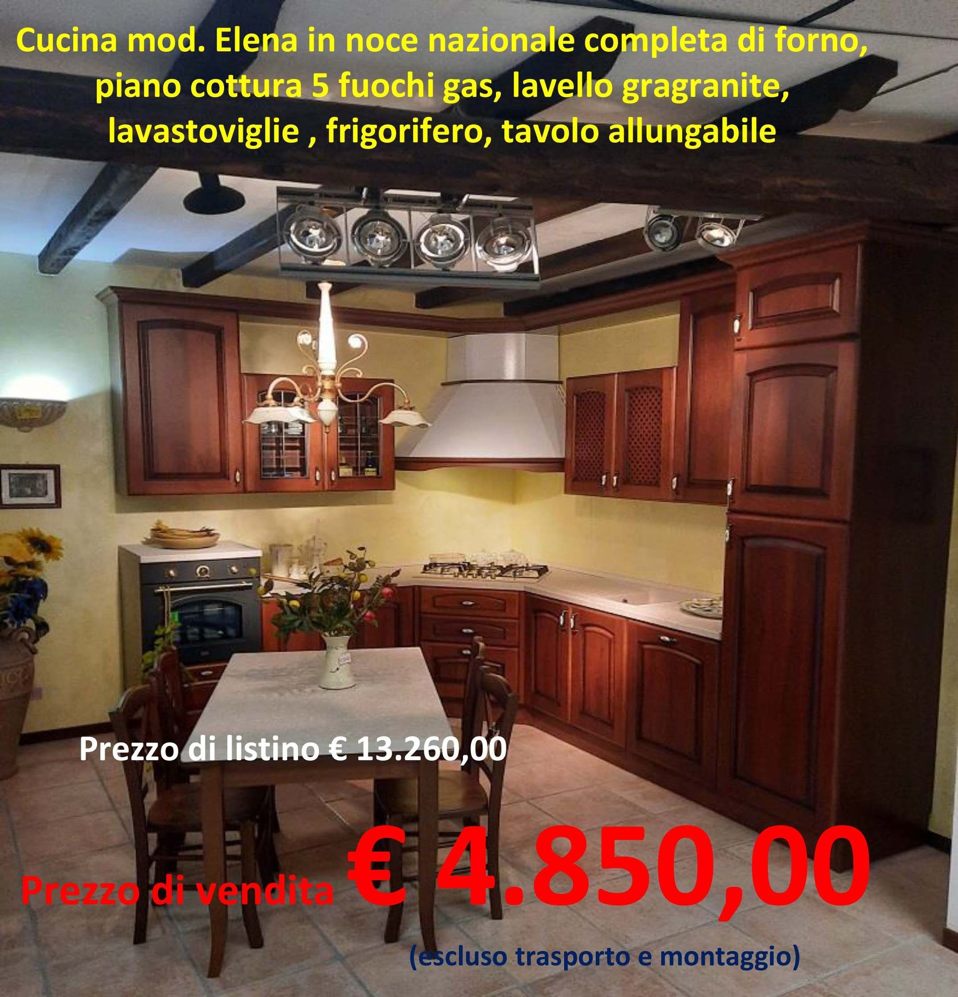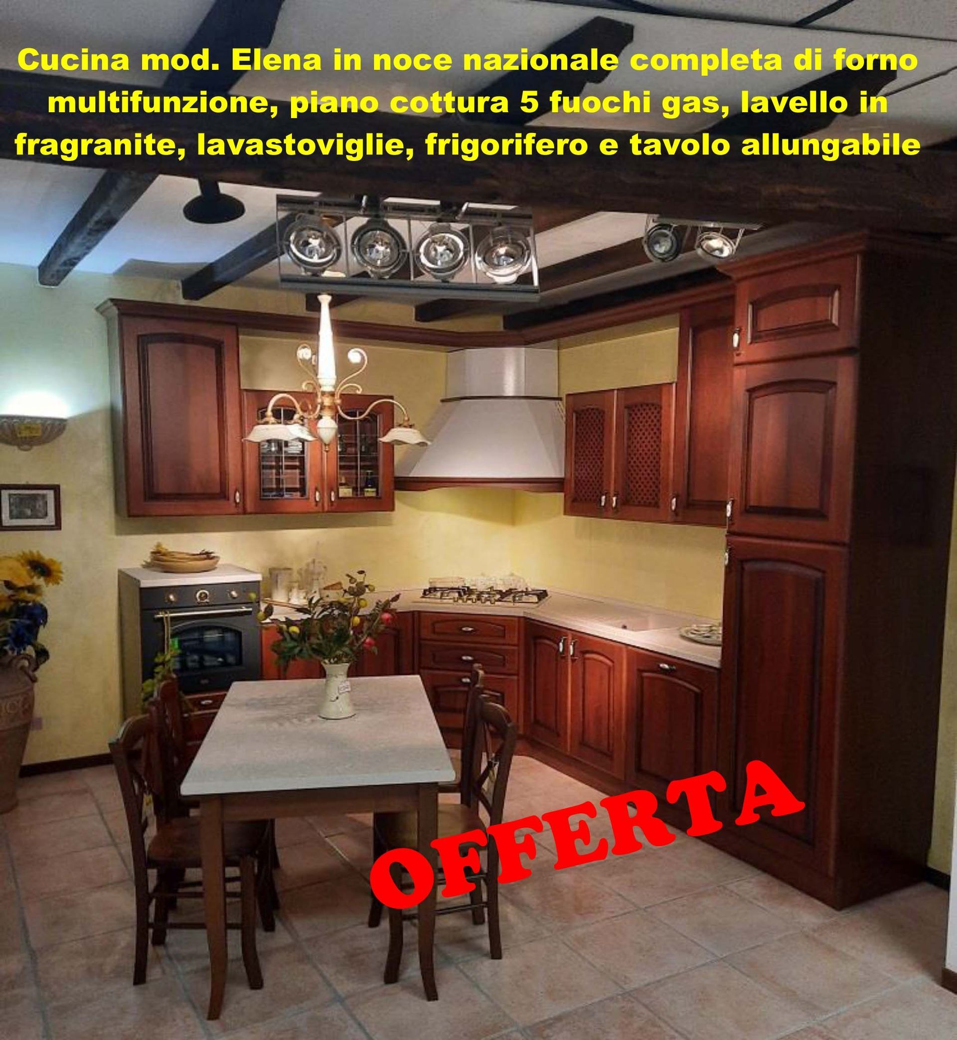 Cucina completa in noce, forno multifunzine, piano cottura 5 fuochi gas, lavello in fragranite, lavastoviglie, frigorifero e tavolo allungabile