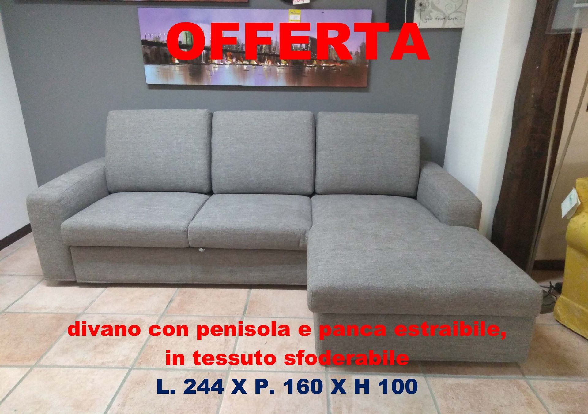 Divano con penisola e panca estraibile in tessuto sfoderabile.