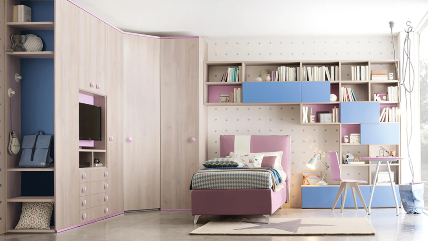 Letto singolo, comodino, armadio a quattro ante e scrivania angolare, liberia e pensili